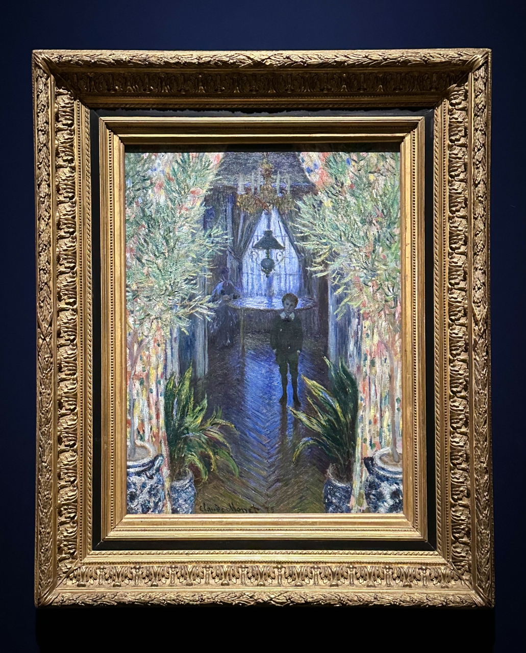 The poetic Corner of an Apartment (1875), depicting Monet's home in Argenteuil near Paris, is one of his few interior paintings. Monet's keen sense of light effects is fully displayed, with the open curtains and plants in the foreground and the dimly lit room beyond creating a dramatic contrast of light and shadow, warm and cool colors. The figures of his son Jean and a woman believed to be his wife, Camille, are depicted very subtly, almost as silhouettes, but the repeated diagonal lines on the curtains and parquet floor guide the eye and emphasize their impact.