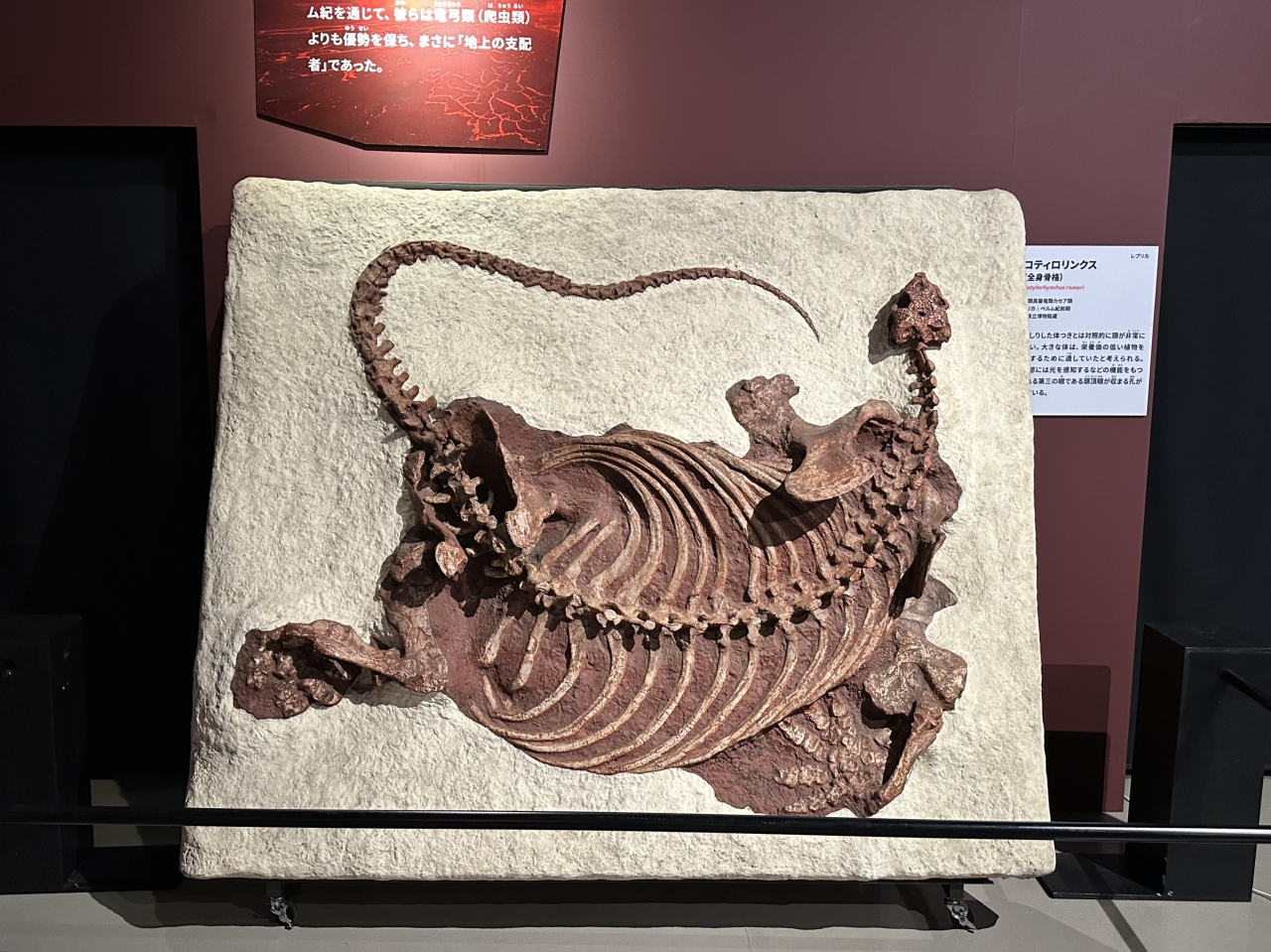 Exhibition view from Episode 3 "PT Boundary: The Greatest Extinction in History" / A complete skeleton fossil (replica) of Cotylorhynchus, a type of synapsid that dominated the land during the Permian period, housed at Tochigi Prefectural Museum
