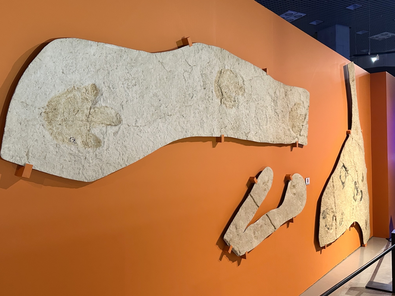 Exhibition view of Episode 4 "TJ Boundary: A Great Transformation to the Age of Dinosaurs" / Footprints are surprisingly cute, dinosaur trail fossils (replica), housed at the Jurassic Museum (Switzerland)