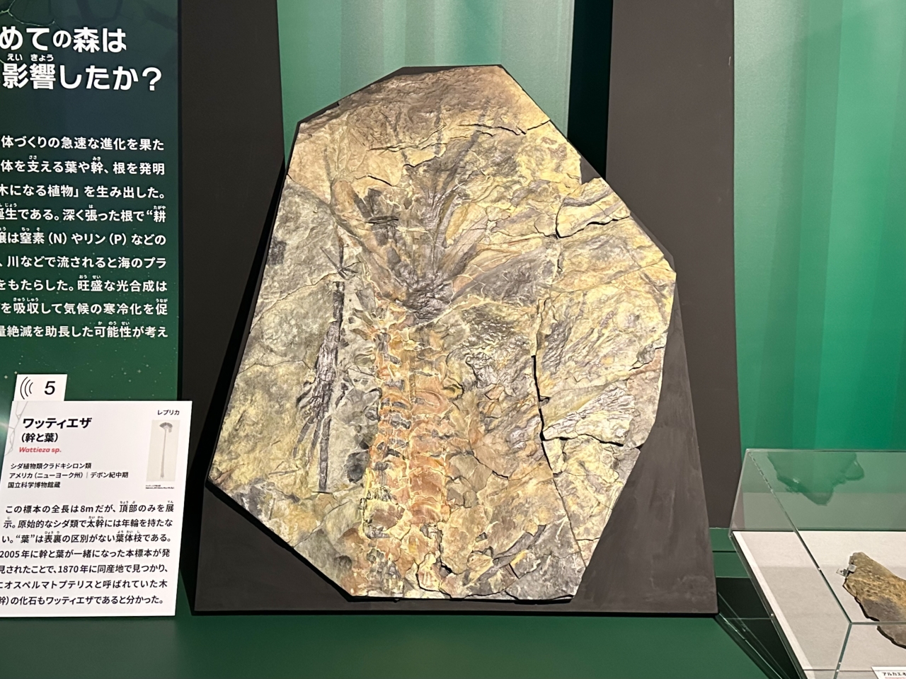 Exhibition view of Episode 2 "FF Boundary: Development of Terrestrial Ecosystems" / Fossil (replica) of Wattierza (stem and leaf), National Museum of Nature and Science