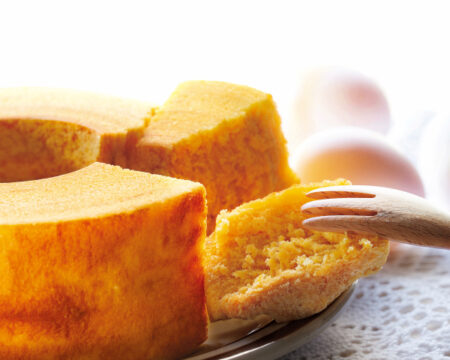 We use lots of eggs to bake this baumkuchen for a soft, fluffy, and moist texture. It has a nostalgic, familiar taste, almost like a rolled omelet.