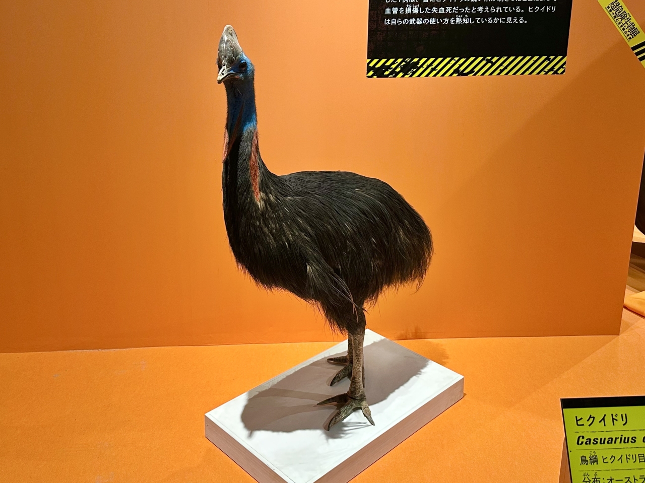 A stuffed specimen of a "power fighter" cassowary, housed at the Abiko City Bird Museum. It holds the Guinness World Record for being the "world's most dangerous bird," and its "spike kick," delivered with its long, sharp, ice-pick-like claws, can shatter a watermelon in a single blow.