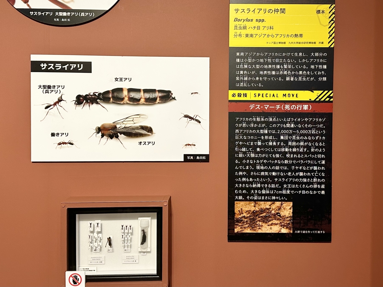 The queen ant, the center of the colony, has long been considered an elusive and almost mythical creature, difficult to even confirm despite years of research by researchers both in Japan and abroad. However, Munetoshi Maruyama, associate professor at the Kyushu University Museum and one of the exhibition's supervisors, and Taku Shimada, an insect explorer and photographer, conducted research in the Republic of Kenya. They reportedly encountered and photographed a queen ant while filming for the TBS program "Crazy Journey." One of these precious queen ant specimens is being exhibited in Japan for the first time at the venue.
