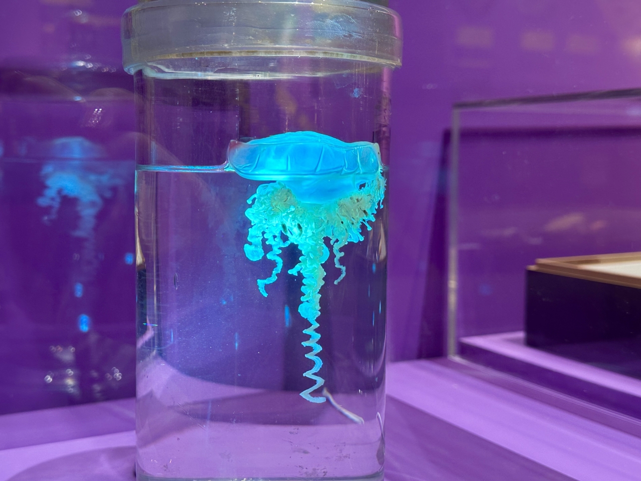 A liquid-preserved specimen of the highly venomous Portuguese man-of-war, owned by the Enoshima Aquarium. In Japan, they appear around springtime. Within milliseconds of contact with the stinger, the stinger extends and injects venom that causes convulsions and sharp pain.