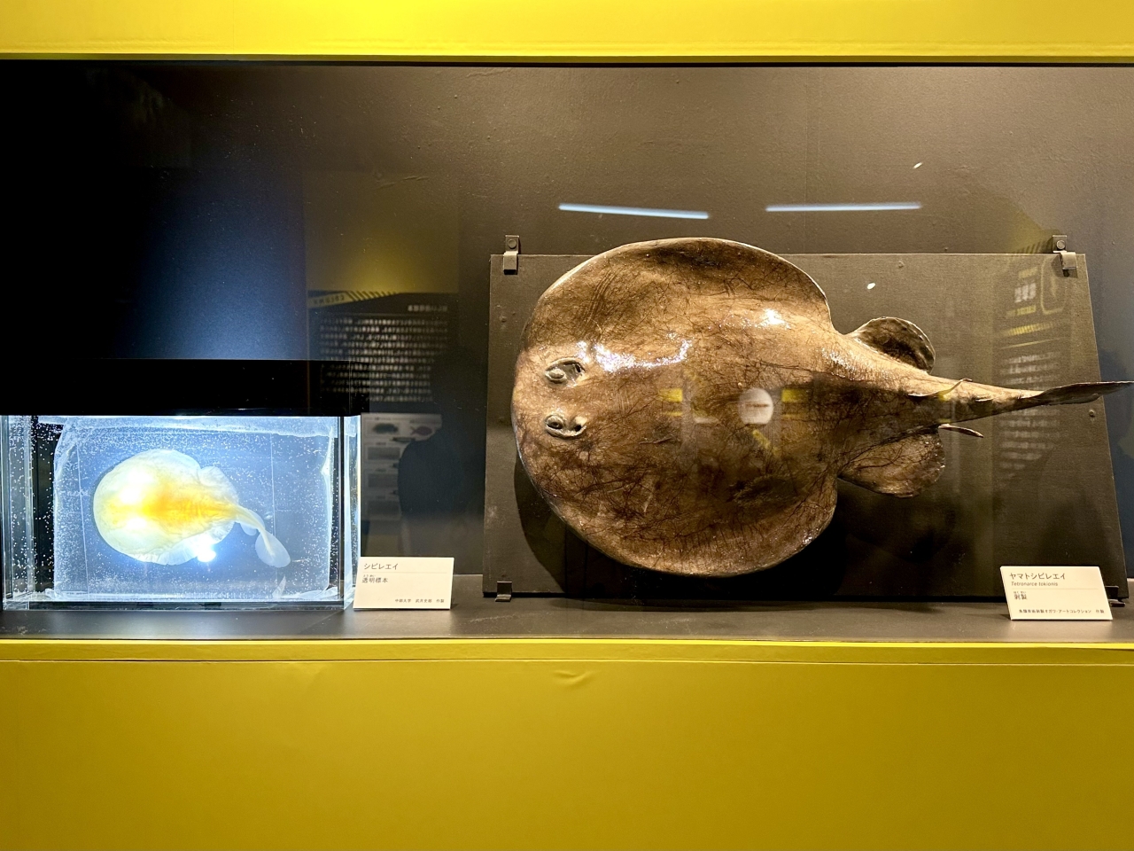 An exhibit of the "electric shock" electric ray. It has a pair of leaf-shaped power-generating organs on the left and right sides of the front half of its body, and there are apparently instances where it has repelled even great white sharks with electric attacks.