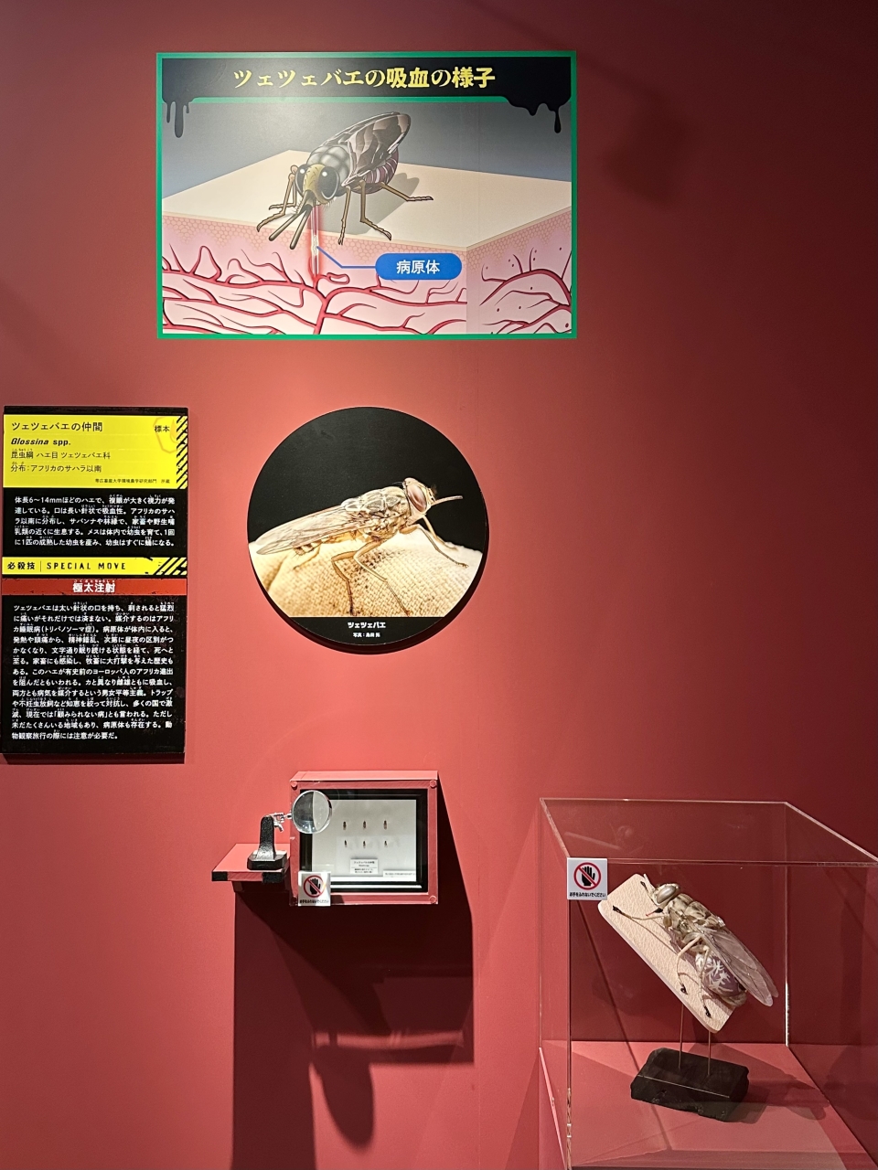 An exhibit featuring the "blood-sucking" tsetse fly. Not only does it cause excruciating pain through blood-sucking, but it also transmits African sleeping sickness, which can lead to fever, headache, mental confusion, coma, and eventually death…