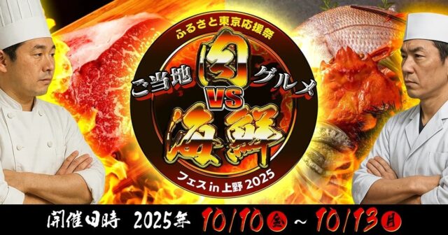 The excitement of the Golden Week gyoza vs. fried chicken showdown is back! The "Hometown Tokyo Support Festival: Local Gourmet Meat vs. Seafood Festival in Ueno 2025," a food festival that colors Tokyo's autumn, will be held for four days from Friday, October 10th to Monday, October 13th, 2025, at Shinobazu Pond and the outdoor stage in Ueno Park. Carrying on the excitement of the hugely popular "Gyoza vs. Fried Chicken Festival" held during Golden Week, this time the ultimate showdown between meat and seafood will be realized! The wildly popular "Gyoza vs. Fried Chicken" battle during Golden Week has been scaled up to "Meat vs. Seafood" this fall! Juicy…