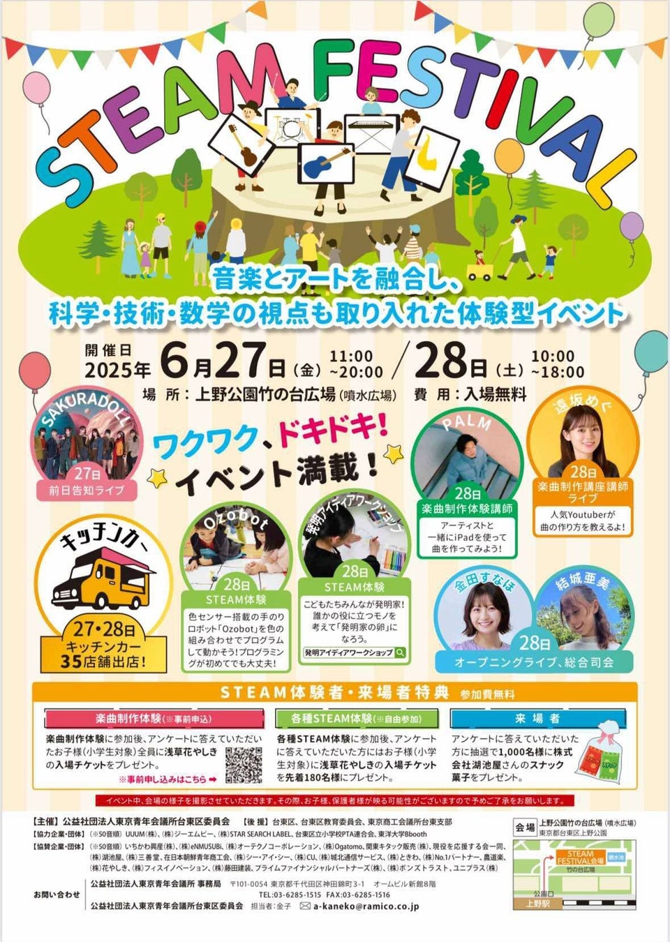 公益社団法人東京青年会議所台東区委員会は、創造力を育みSTEAM教育を広めるため、上野恩賜公園竹の台広場(噴水広場)にて6月27日(金)28日(土)の2日間、音楽やプログラミングなどを通じてSTEAM教育に触れ合える、体験型イベントを開催します。
