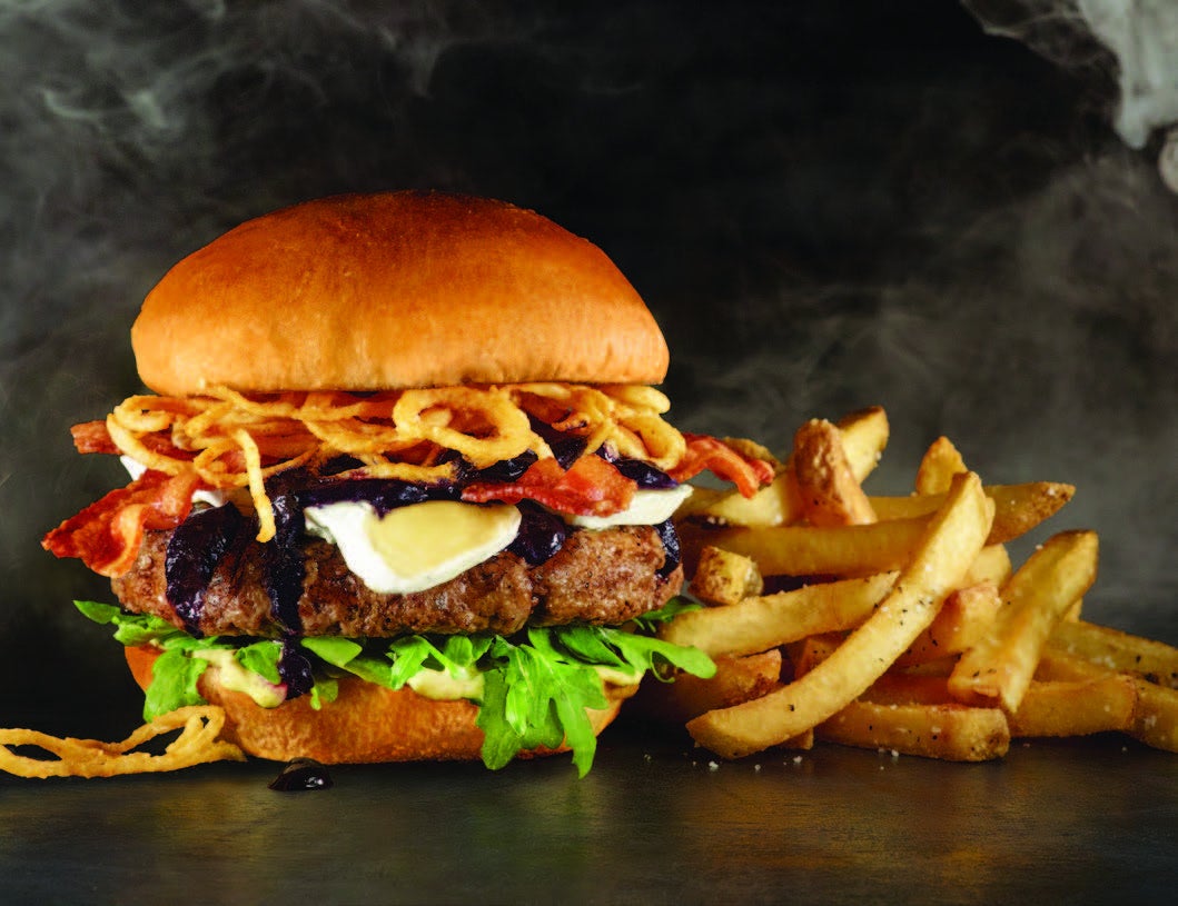 「ブーベリーバーガー」はマスタードマヨネーズを塗ったバンズにルッコラ、カマンベールチーズ、ブルーベリーソース、ベーコン、フライドオニオンをトッピングした味わい深いハンバーガー。