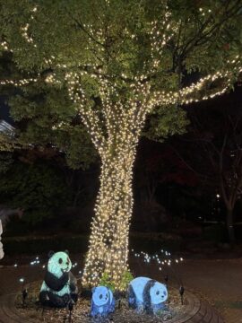 不忍池の夜を照らすイルミネーションと、かわいいパンダオブジェが登場。