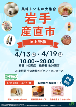 開催日時: 2026年4月13日(月) ~4月19日(日) 東日本旅客鉄道 ㈱ 盛岡支社 と㈱ JR 東日本青森商業開発 は 、岩手県と連携して、地域活性化・観光流動の創出を目的とした「岩手産直市」を上野駅…