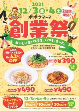 ~次回ご利用できるステップアップクーポン券もプレゼント! ~ 株式会社ポポラマーマは、12月3日の創業27周年を記念し、当社が展開する、ゆであげ生パスタ専門店ポポラマーマ全店で、人気商品3品を最大42%OF…