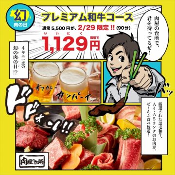 『⿊⽑和⽜⾷べ放題』で⼈気の「⾁屋の台所」全店にて、2⽉29⽇(幻の⾁の⽇)にちなんで、4年に一度の肉の日キャンペーンを開催致します! 29名様限定で、A4・A5ランクの⿊⽑和⽜含む全100品食べ放題(90分)『プレミア…