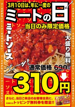 株式会社B級グルメ研究所(東京都武蔵野市:代表取締役社長 坂本憲史)が運営する飲食店「スパゲッティーのパンチョ」各店にて、3月10日(金)を日付の語呂に合わせ“ミート(310)の日”とし、「ミートソース」(通常価格690…