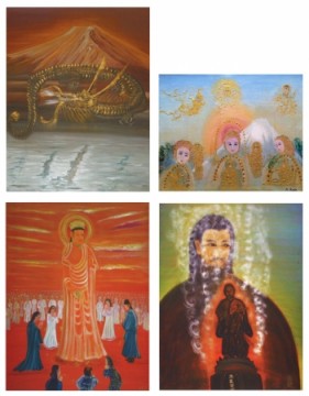 作品画像左上:山中湖の龍神様 / The Dragon in Lake Yamanaka(F100号) 作品画像右上:希望~光の世界(F20号) 作品画像左下:真の愛に 心をひとつに / A Sense of Onene…