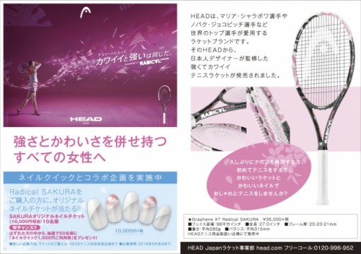 首都圏を中心にネイルサロン「ネイルクイック」「スパネイル」「ネイルパフェ」を国内外に展開している株式会社ノンストレス(本社:東京都渋谷区、代表取締役社長 坂野尚子)は、2016年3月28日より、HEADテニスラケット「R…