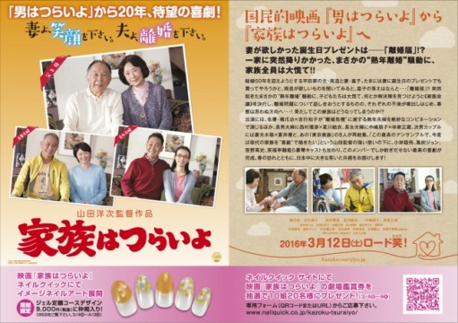 首都圏を中心にネイルサロン「ネイルクイック」「スパネイル」「ネイルパフェ」を国内外に展開している株式会社ノンストレス(本社:東京都渋谷区、代表取締役社長 坂野尚子)は、2016年3月4日より、映画『家族はつらいよ』(3月…