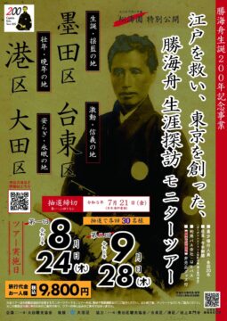生誕200年記念事業「勝海舟生涯探訪モニターツアー」 本年生誕200年を迎えた勝海舟の生涯に深く関わる、生誕・揺籃の地である墨田区、信義・激動の地である台東区、壮年・晩年の地である港区、安らぎ・永眠の地であ…